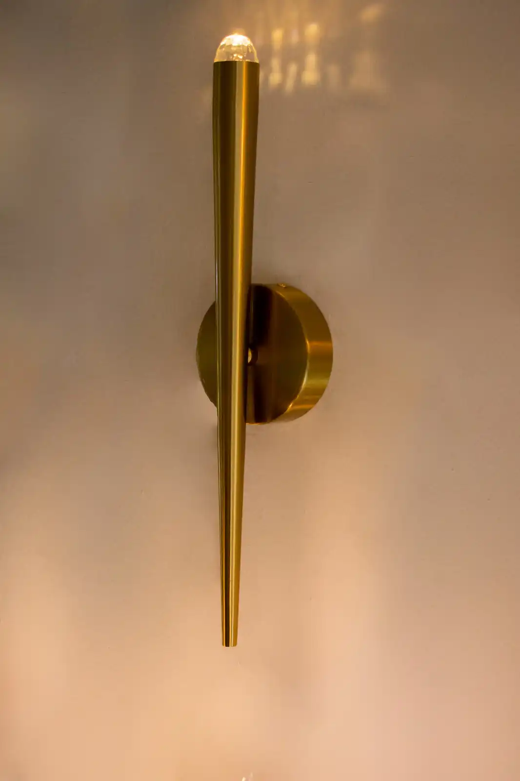 La luz se emite únicamente desde la punta del cuerpo cónico, mediante tecnología LED de 2 W y temperatura cálida de 3000 K, lo que genera una iluminación puntual sin deslumbramiento. Puedes instalarlo hacia arriba o hacia abajo según el efecto deseado, lo que le brinda versatilidad de uso. La base circular de 10 cm de diámetro asegura un montaje discreto y firme, mientras que la salida de pared es de solo 7 cm, lo cual mantiene el objeto próximo al muro para un perfil limpio y contemporáneo.