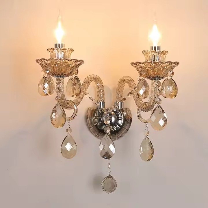 Cuenta con dos luces tipo E14, ideales para bombillos LED cálidos que realcen los destellos del cristal. Cada brazo, cuidadosamente diseñado en forma retorcida, mide 15.24 cm (6 pulgadas) y crea un arco armónico que distribuye la luz con sutileza. La estructura tiene un ancho de 33 cm, alto total de 38 cm, y desde el centro del aplique hacia la parte superior hay 28 cm. Su base mural mide 12 cm de ancho por 8 cm de alto, con una salida de la pared de 23 cm, asegurando presencia sin ocupar espacio excesivo.