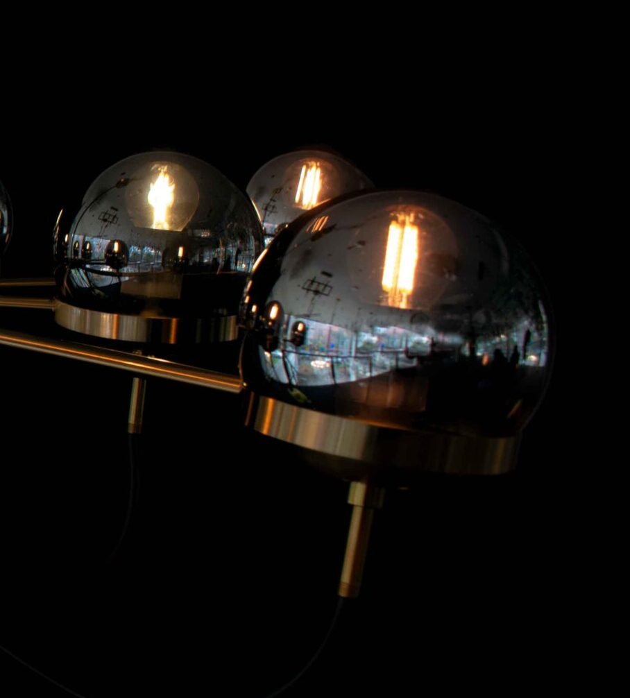 Sumérgete en la nostalgia con nuestra lampara de bolas araña de techo vintage colgante, ideal para comedor, techos altos o espacios amplios. Su herraje en negro mate con toques en dorado mate y bolas en color humo evocan el encanto de décadas pasadas, añadiendo un toque de distinción a cualquier ambiente.