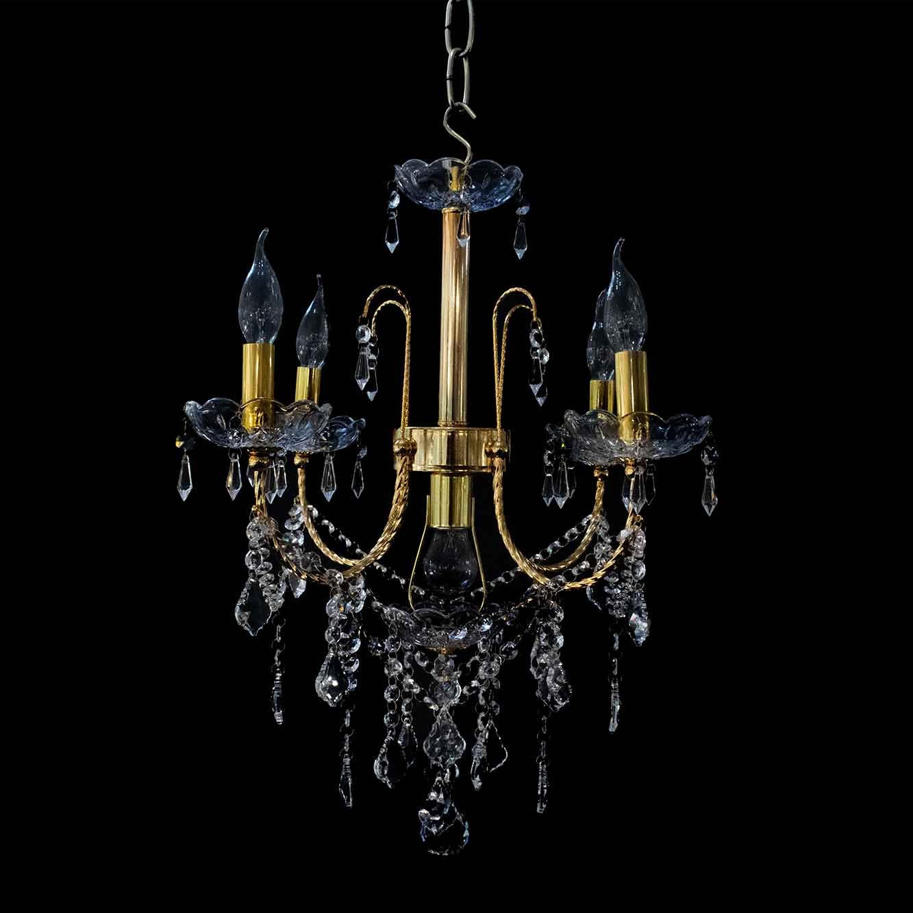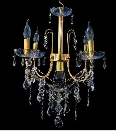 Nuestra lámpara tipo chandelier presenta un diseño único con brazos metálicos dorados o cromados, complementados por cristales en forma de plaqueta. Cada detalle ha sido cuidadosamente elaborado, desde los brazos metálicos torneados hasta las plaquetas transparentes de 2 pulgadas y la bola central de 4 cm.