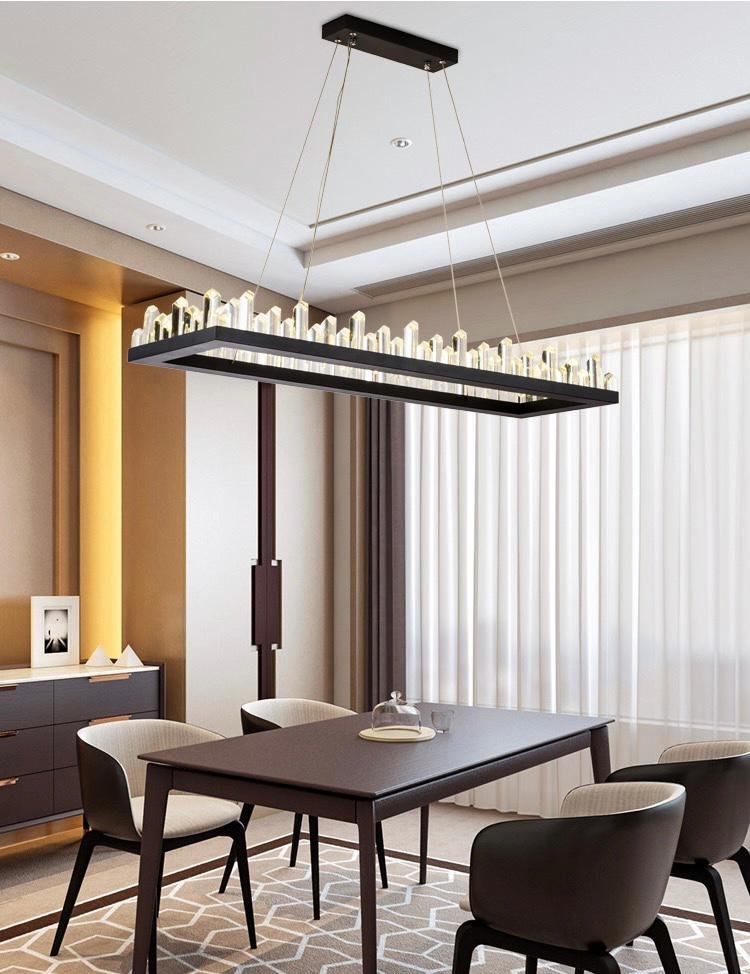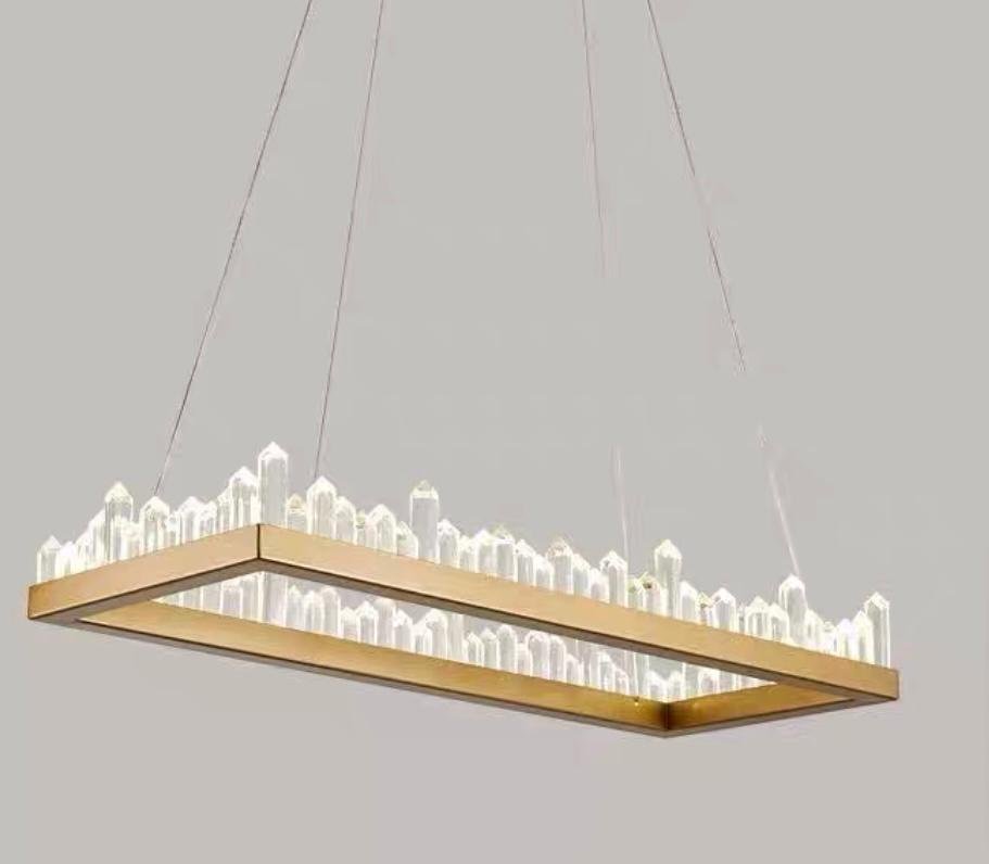 Lámpara de cristal rectangular techo LED integrado colgante, su diseño se caracteriza por tener un herraje metálico en donde se unen cristales en forma de prisma, macizo en la parte superior con imán. Todo el herraje es en aluminio color dorado. Maneja cristal tipo prisma de diferentes alturas transparentes.